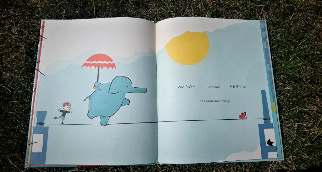 Die LeserInnen begeben sich mit einem kleinen Jungen, seiner Katze und einem blauen Elefanten auf einen Streifzug durch die Welt der Gegensätze. Manchmal begleiten wir sie durch einfache Alltagssituationen, manchmal in aberwitzigen, wenn sie beispielsweise auf einem dünnen Seil balancieren. Zu Beginn scheint alles noch recht einfach, es gibt den Tag und auf den folgt die Nacht. Doch von Seite zu Seite wird es vertrackter mit den Gegensätzen. Groß oder Klein, so schwer kann das ja nicht sein. Meint man zumindest. Aber was passiert nun, wenn der große Elefant plötzlich neben einer noch größeren Blume oder gar einem Hochhaus steht? Ist er jetzt noch groß oder eher klein? Und wer steht in einer Schlange eigentlich vorn und wer hinten? Mit viel Scharfsinn hebelt Susan Hood allzu sicher Gewähntes aus der Verankerung und zeigt den Kindern, dass sie nicht zu vorschnell mit ihren Urteilen sein sollten. Es ist stets auch eine Frage der Perspektive und sogar die ist nichts Festgelegtes. Für Kinder ist dies eine wichtige Erkenntnis, es gibt verschiedene Sichtweisen auf Dinge, manchmal sollte man seine Perspektive wechseln, um Neues zu entdecken, manchmal muss man seinen Standpunkt wechseln, um sich einen Überblick zu verschaffen.