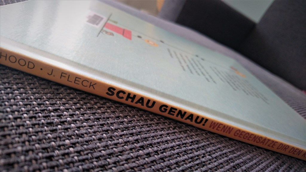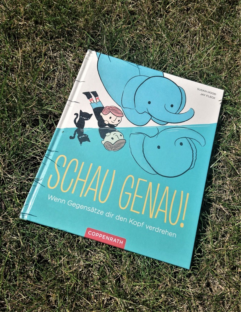 Klein oder groß, vorn oder hinten, gerade oder krumm – Gegensatzpaare erfreuen sich bei BilderbuchautorInnen großer Beliebtheit. Die Strukturen sind einfach umsetzbar und für Kinder wichtig, um ihre Lebenswelt verstehen, ordnen und benennen zu können. Viele Bilderbücher zu dem Thema bieten allerdings ein bloßes Abarbeiten der Paare. Dass es auch pfiffiger geht, beweisen Susan Hood und Jay Fleck mit ihrem Buch „Schau genau! Wenn Gegensätze dir den Kopf verdrehen“.