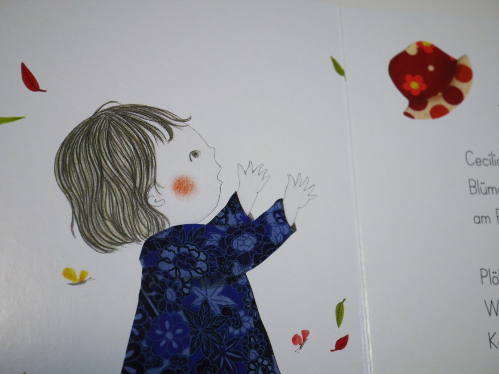Die zarten und aufs Wesentliche beschränkten Illustrationen von Baptistine Mésange verleihen der Reise einen ganz besonderen Zauber. Der Hut ist in einem kräftigen Rot dargestellt und wird so nicht nur inhaltlich, sondern auch visuell zum roten Faden, der die Geschichte durchzieht. Trotz aller Reduziertheit finden sich auf jeder Seite kleine liebevolle Details. Mésange haucht der kleinen Cecilia vor allem durch die liebevoll dargestellte Gestik und Mimik Leben ein, sodass deren Fröhlichkeit und Neugier auf die LeserInnen überspringt. Wenn sie am Ende lachend und klatschend den Wind um die Wiederholung dieser kleinen Reise bittet, werden die Kinder sicherlich auch die Vorlesenden um eine schnelle Wiederholung bitten.