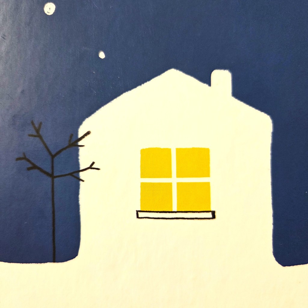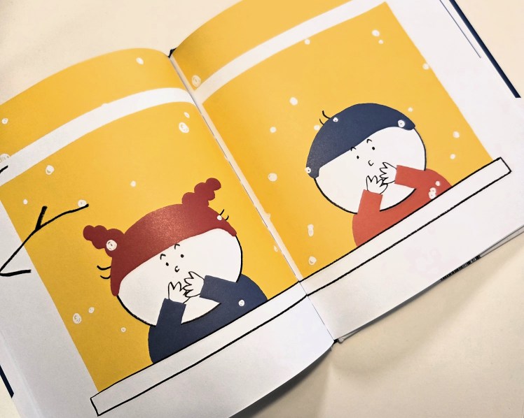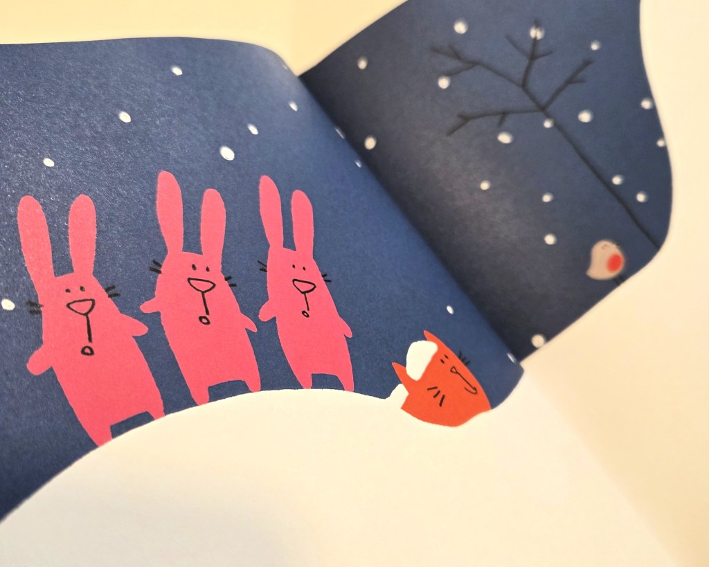Bereits auf dem Cover können wir das gesamte Setting dieser Geschichte sehen: ein eingeschneites Häuschen, dessen Fenster in warmen Gelb leuchten und ein kleiner Baum. Durch dieses Fenster beobachten wir zwei Kinder, die nach draußen schauen. In dieser ruhigen, verschneiten Landschaft gibt es zu Beginn wenig zu entdecken, ein Vogel setzt sich neben den Baum, drei Hasen kommen angehoppelt, weitere Tiere tauchen auf. Und plötzlich entwickelt sich ein Geschehen, mit denen weder die Protagonisten noch die Leser gerechnet hätten.