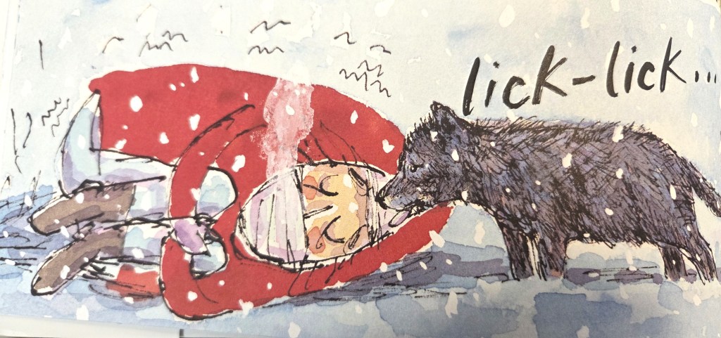 Seit Jahrhunderten haben Wölfe in der Literatur keinen besonders guten Stand. Zwar kommen sie häufig in Geschichten vor, meist werden sie jedoch als gefährlich oder gar bösartig dargestellt. Wenn dann noch ein Mädchen im roten Mantel hinzukommt, ist die Deutung nur allzu klar. Ob Märchen oder moderne Erzählung, wenn ein Wolf darin vorkommt, dann ist es traditionell der böse Wolf. Dabei sind Wölfe und Menschen sich ähnlicher, als man im ersten Moment meinen könnte. „Wolf in the snow“ bricht mit dieser erzählerischen Zuweisung und zeigt den Wolf als das, was er naturgemäß ist. Ein Tier, das im Familienverbund lebt, das die eigene Familie vor möglichen Gefahren schützt und dessen Kinder auch hilfsbedürftig sind. Cordells #silentbook ist ein einfühlsamer Appell jedem Lebewesen mit Respekt zu begegnen.