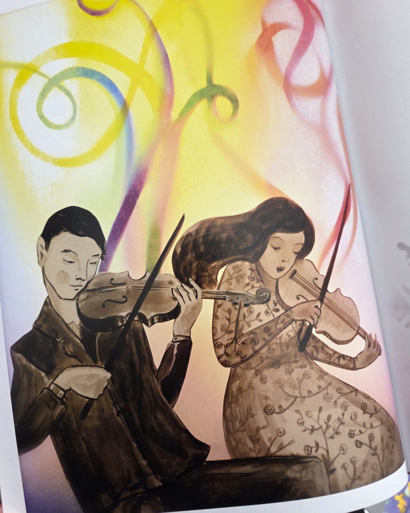 Bereits mit 15 Jahren stand für MacKay fest, dass sie ihrer Liebe zur Papierkunst auch beruflich nachgehen will. So ist es nicht verwunderlich, dass man jedem ihrer Kunstwerke die jahrelange Erfahrung und tiefe Leidenschaft intensiv anmerkt. Die einzelnen Papierelemente sind größtenteils mit Tinte illustriert, gezielt setzt sie je nach Blickwinkel und Stimmung innerhalb der Geschichte mal nostalgische Sepia-Töne, mal leuchtende Farben ein. So dominieren gerade zu Beginn gedeckte Farbtöne, die das triste Wetter und die schlechte Laune des Mädchens widerspiegeln, während das Geschehen auf der Bühne mit dem ersten Ton der Streicher in schillernde Farben getaucht ist. Doch nicht nur die Farben an sich bringen die Lebendigkeit in das Buch. MacKay beleuchtet ihre Dioramen vom Hintergrund aus. Mal sanft und mal kräftiger, bringt sie so eine faszinierende Leuchtkraft in die Szenerie. Ihre Papierkulissen sind bis in den letzten Winkel atemberaubend gestaltet.