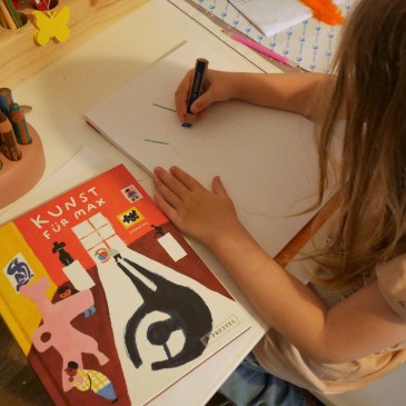 Kinder und Kunst passen zusammen – das wird vermutlich jeder bestätigen, der einmal ein malendes Kind beobachtet hat. Es liegt ein ganz besonderer Zauber in der Freude eines Kindes über das eigene geschaffene Werk. Dennoch steht ein Besuch mit kleinen Kindern im klassischen Kunstmuseum für die meisten Eltern auf der Liste der Ausflugsziele eher weit unten. Wenn man nachhakt, woran das liegt, stößt man immer wieder auf die gleichen Bedenken: Die Aufmerksamkeitsspanne der Kinder sei zu kurz, dazu kämen noch die vielen Museumsregeln, die eher nicht der kindlichen Natur entsprächen und welches kleine Kind habe schon den nötigen Horizont, um die Werke angemessen zu erfassen? Bei dem Gedanken, mit einem eingeschränkten und gelangweilten Kleinkind im Museum zu sein, bricht den meisten Eltern dann auch schon der Schweiß aus. Schön, dass die Illustratorin Joanne Liu für diesen Fall schon mit einem Tuch parat steht, denn in ihrem Bilderbucherstling „Kunst für Max“ zeigt sie, dass auch kleine Kinder und Kunstmuseen durchaus zusammenpassen, wenn man sie dort auch Kind sein lässt. … Mehr Kunst für Max